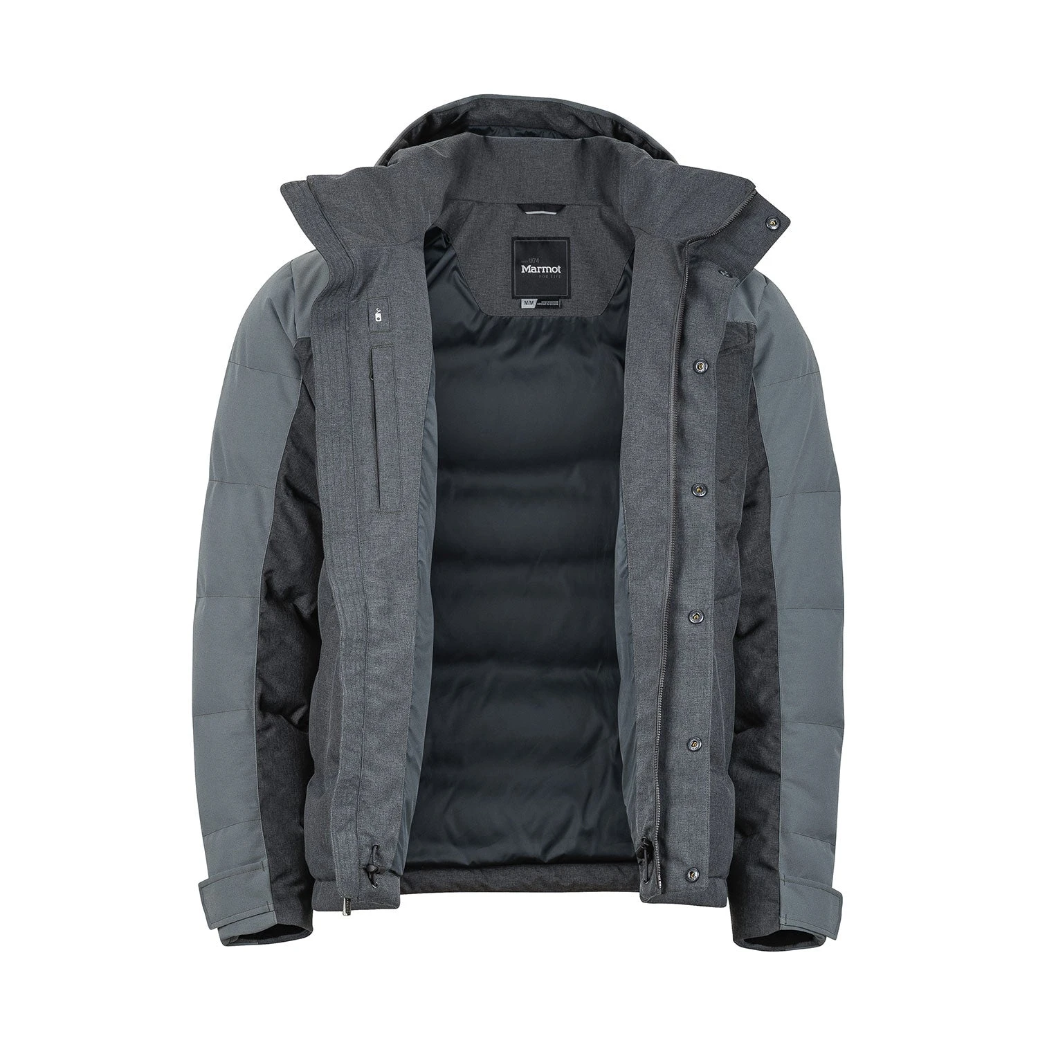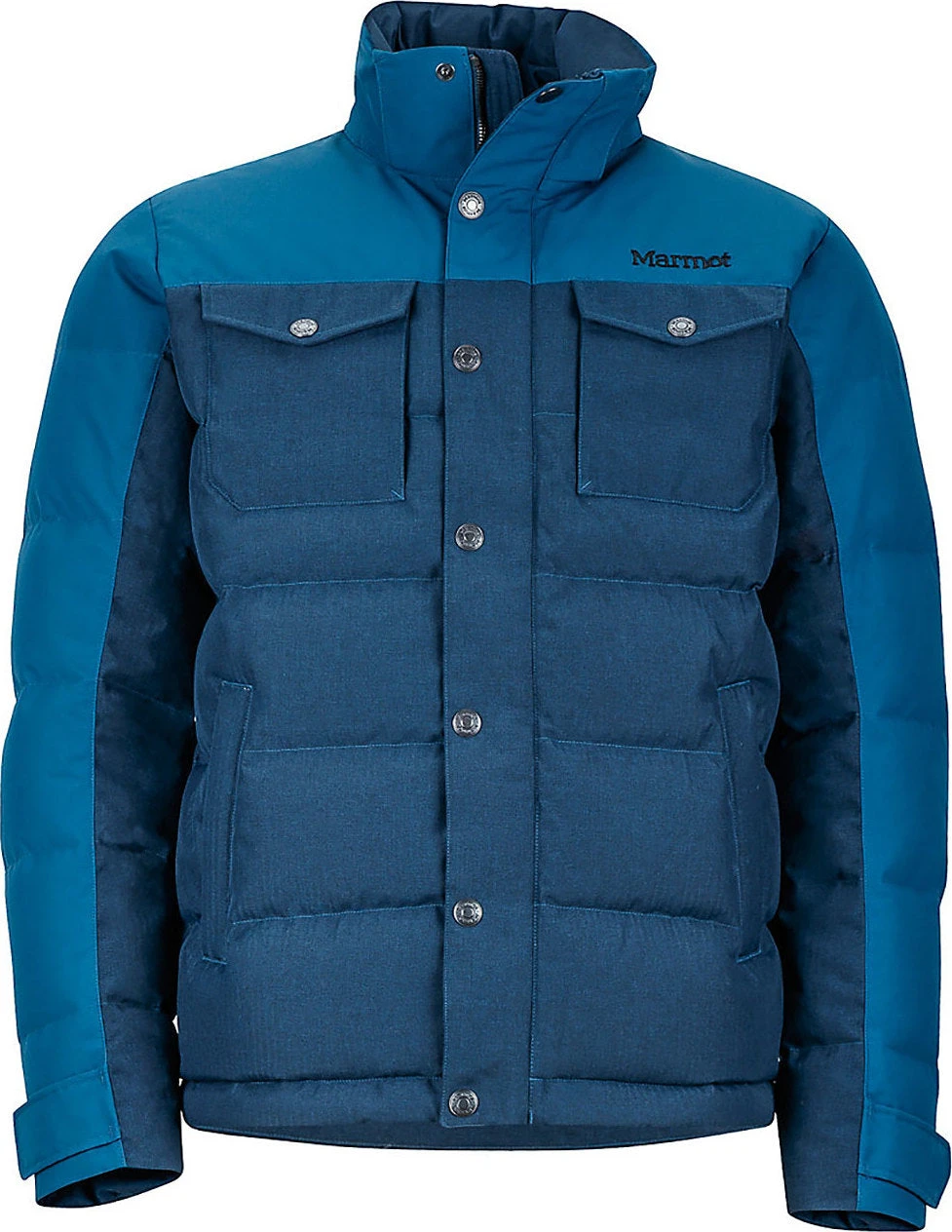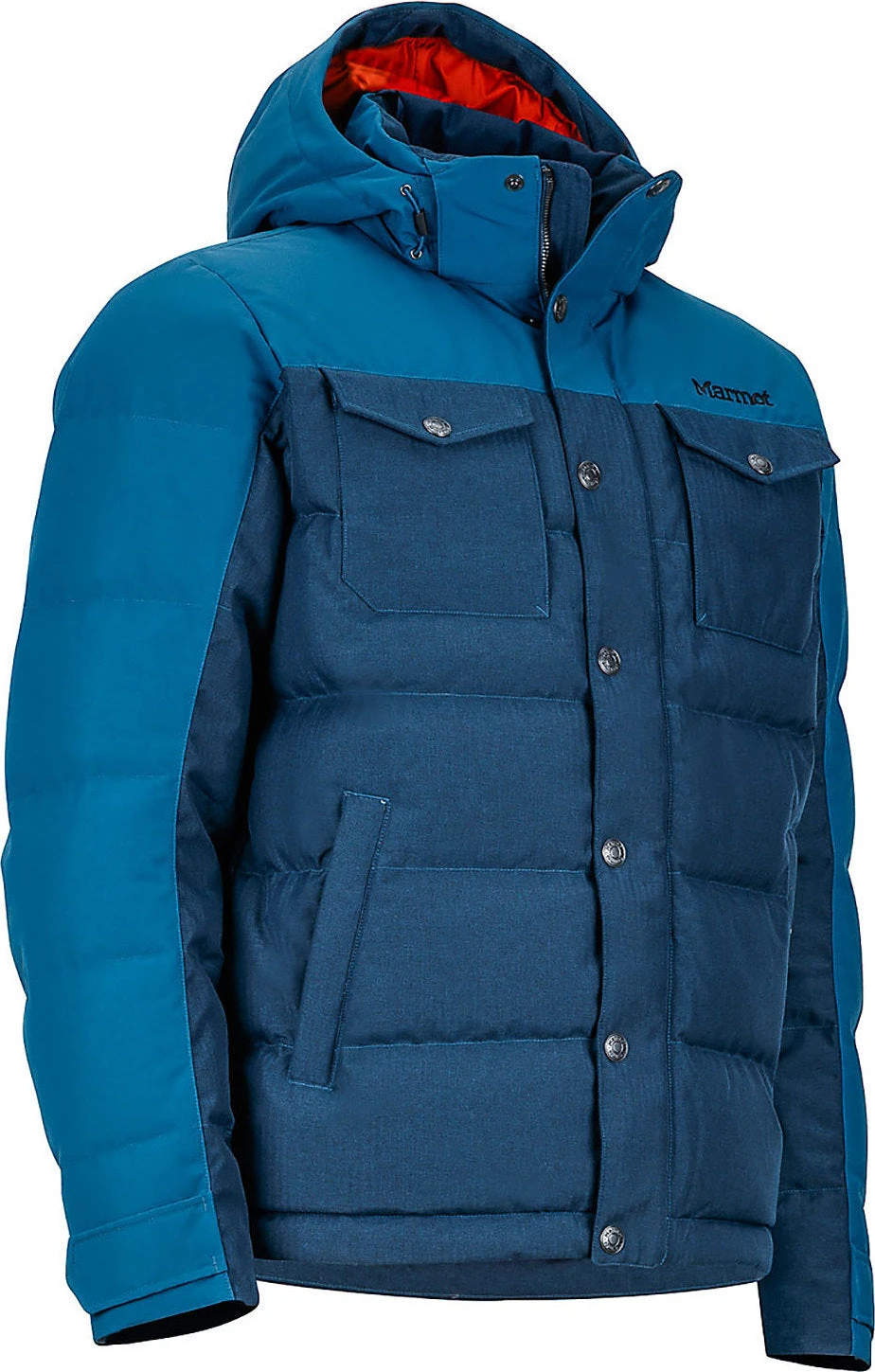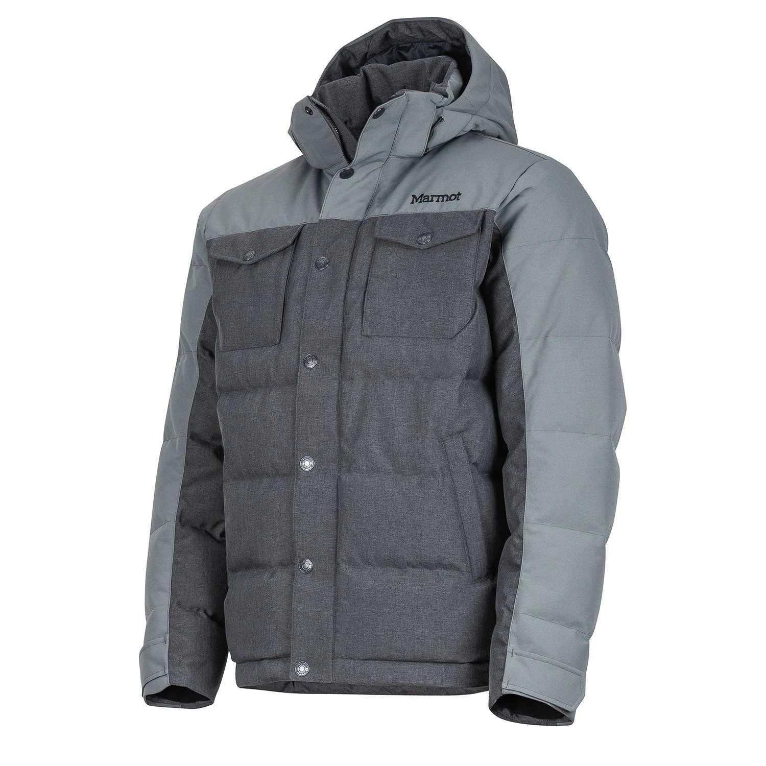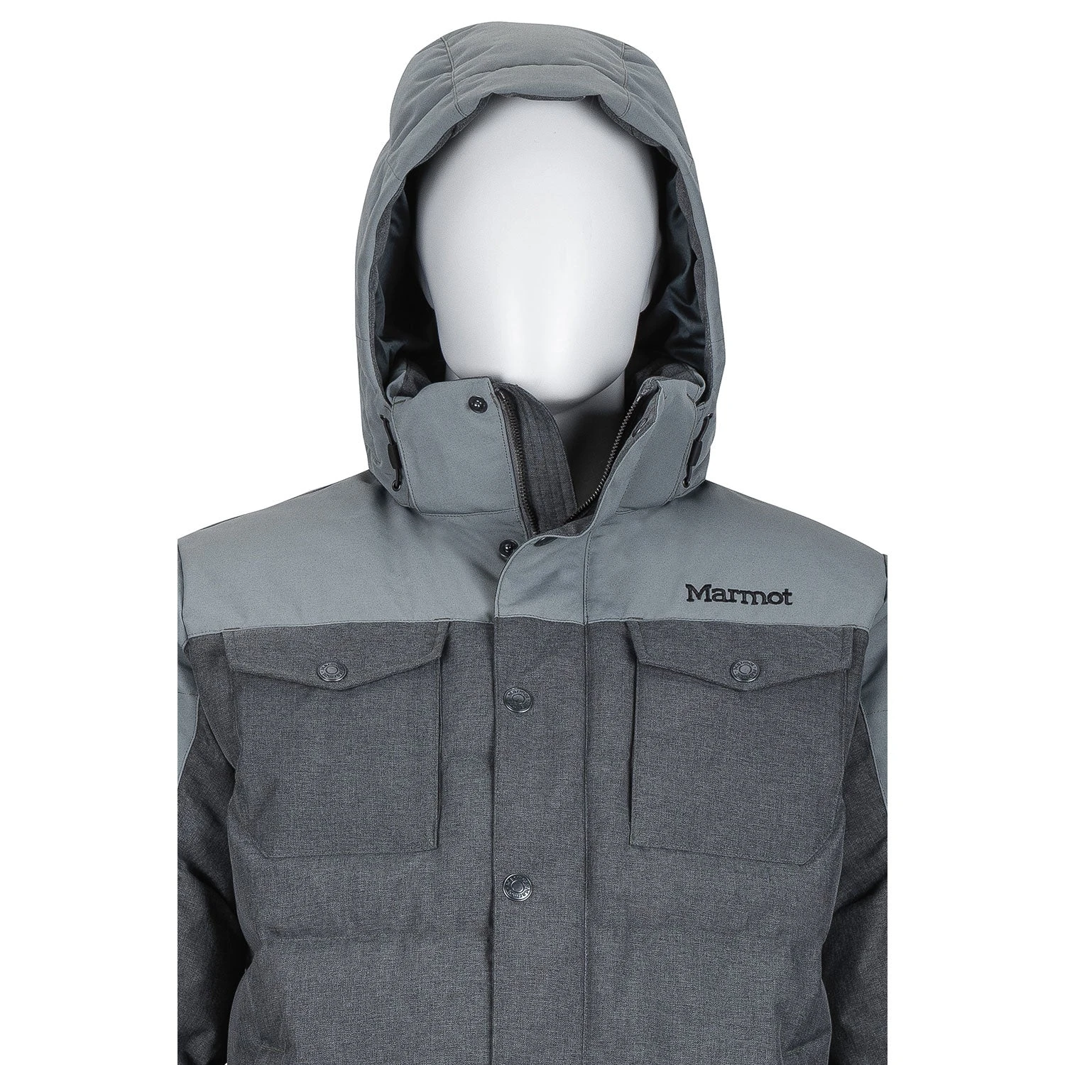 The men’s FORDHAM jacket by Marmot has the durability to match its rugged, outdoorsman looks. 700 fill power down lines this jacket, delivering tremendous thermal capacity and warmth. Its shoulders and arms are finished with a long-lasting 2L Herringbone Twill, while sturdy 2-layer Plain Weave with a waterproof MemBrain guards the jacket body. These protective weather-shielding weaves shed light rain and snow, making this jacket perfect for cold urban outings. The insulated hood zips off, allowing for a different wearing style. Along with the button-flap chest pockets, the Fordham jacket features zip hand pockets and a zippered internal media pocket.