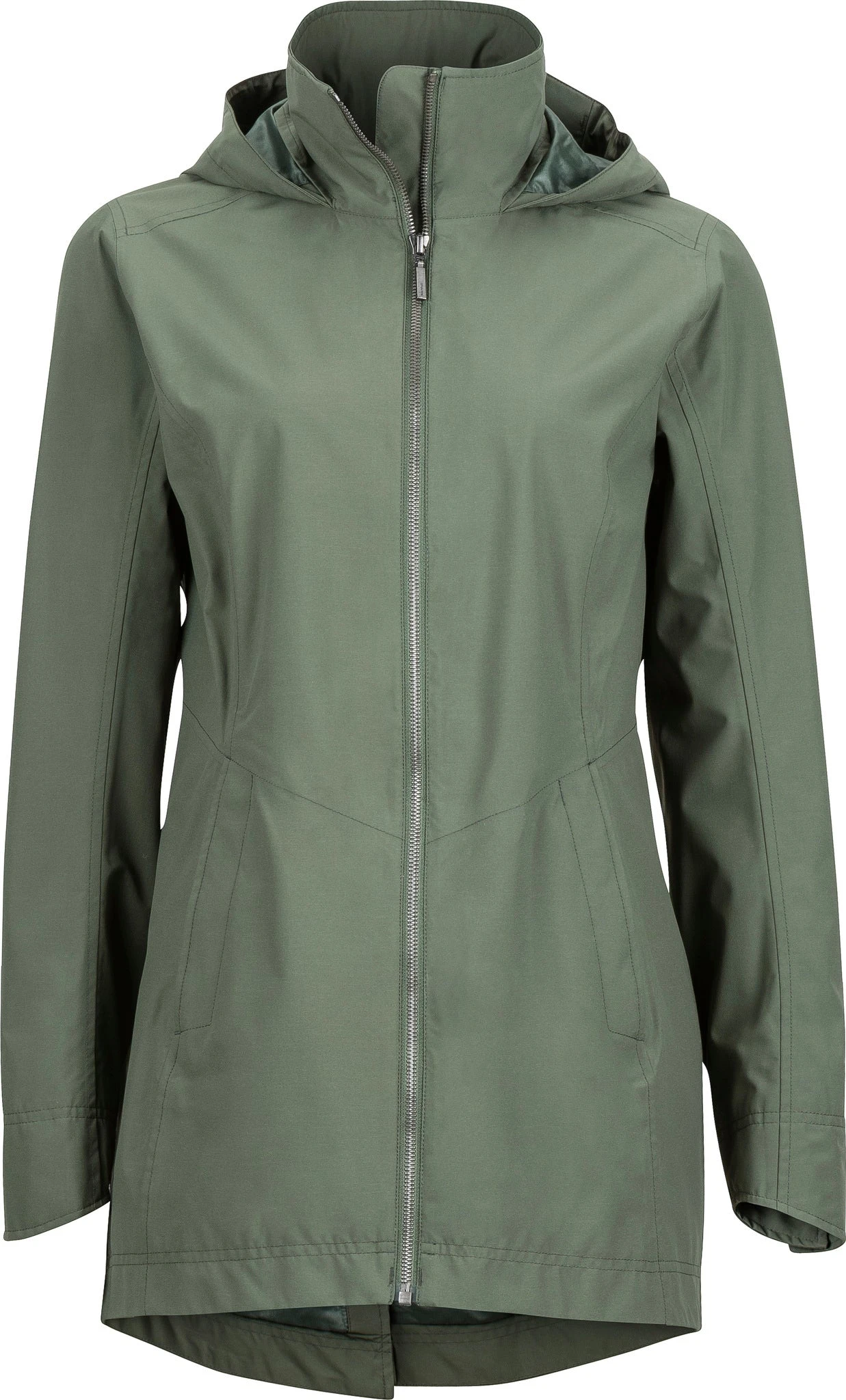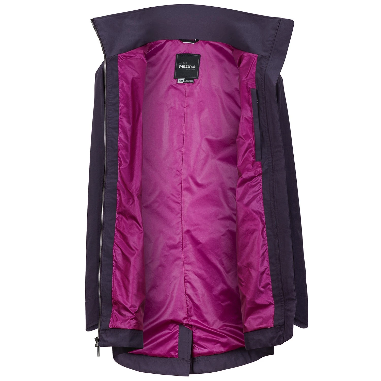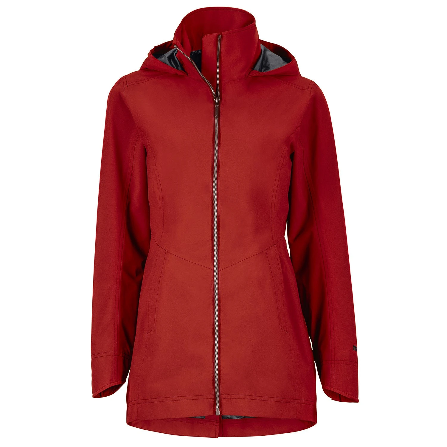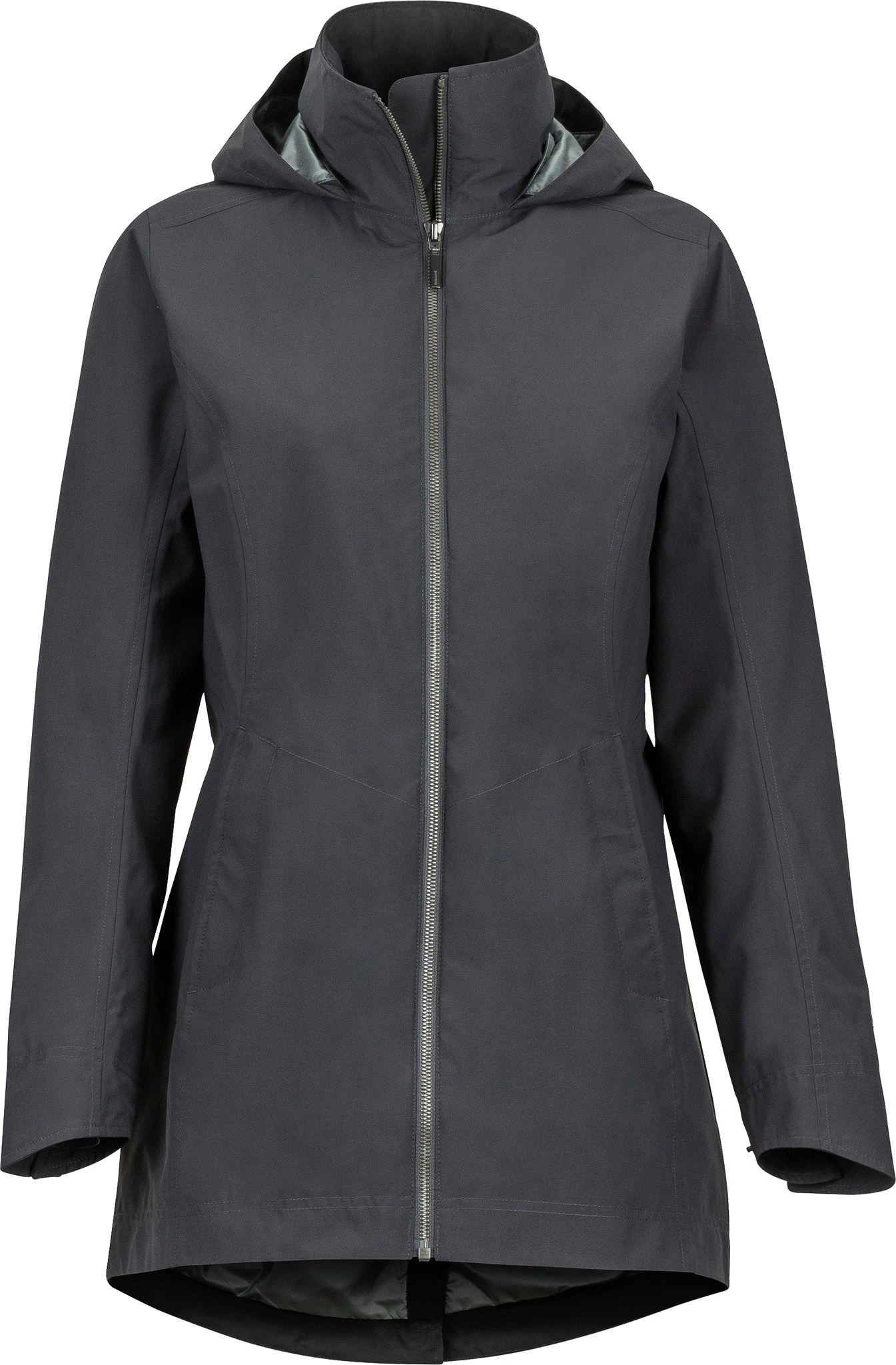 The women’s LEA Jacket by Marmot is a completely waterproof city slicker with a stylish cut and practical protection. The breathable membrane is waterproof and has taped seams to seal out moisture. tuck the attached hood away when you don’t need it. Two zip hand pockets secure essentials. Tighten up the snap cuffs when the wind blows the rain all around.Â