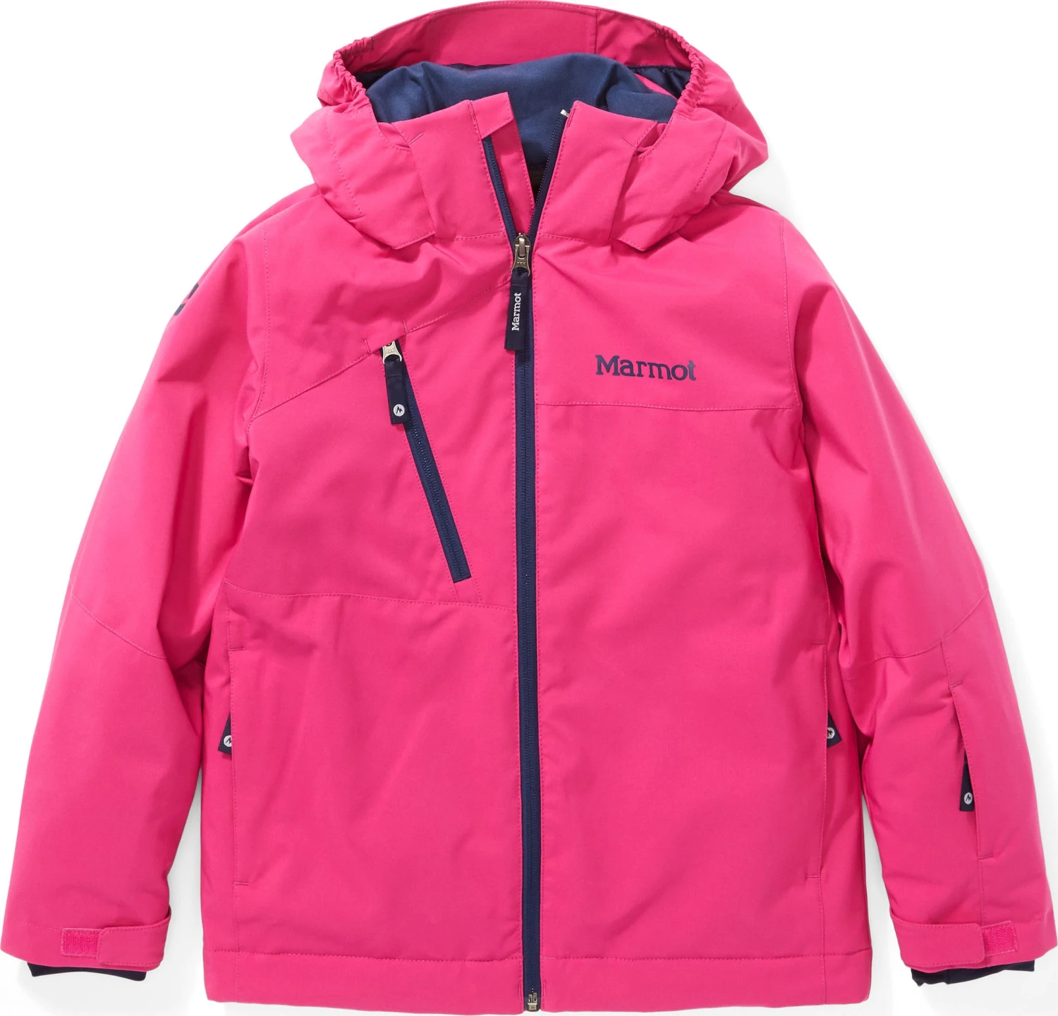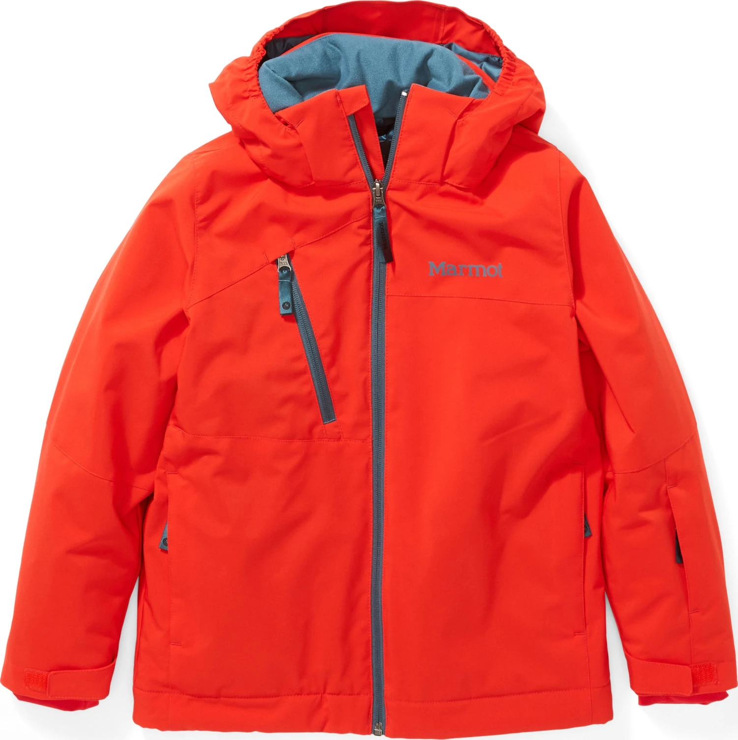 A kids ski jacket with stretch mobility, removable hood, and 120g of Thermal R synthetic insulation.
