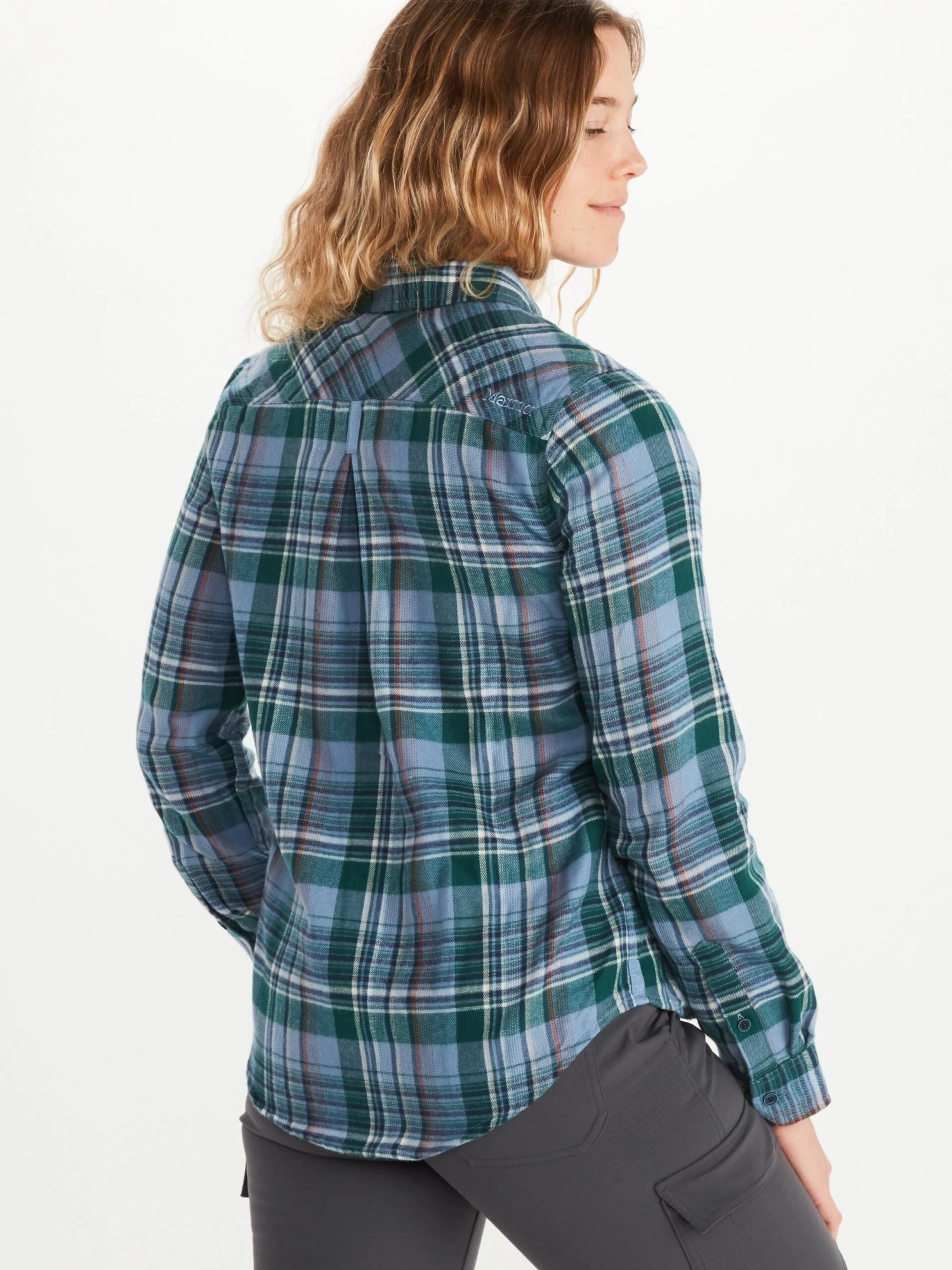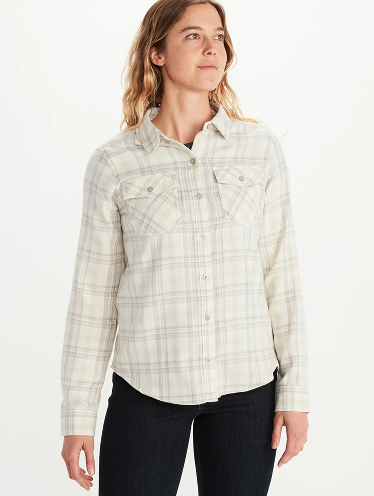From chilly afternoons on the trail to brisk walks to the gear store for your next hike, the midweight Women’s Bridget Long-Sleeve Flannel Shirt will keep you warm. You don’t have to hide under the treetops on sunny days, thanks to the built-in UPF 30 protection. Reduce your environmental impact with Marmot UpCycle® fabric, which is made from post-consumer plastic bottles that are recycled into quick-drying polyester fabric then blended with cotton.